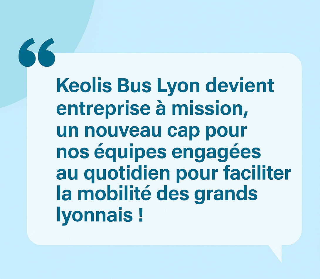 Accompagné par MAOBI Innovation, nous avons engagé un travail de fond pour structurer notre stratégie d’impact, définir nos engagements et formaliser notre mission. Ce processus collaboratif a permis à Keolis Bus Lyon d’inscrire dans ses statuts une mission forte et incarnée, issue de plusieurs mois de réflexion collective :